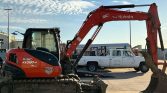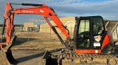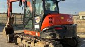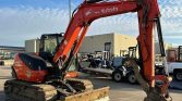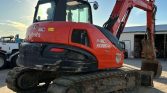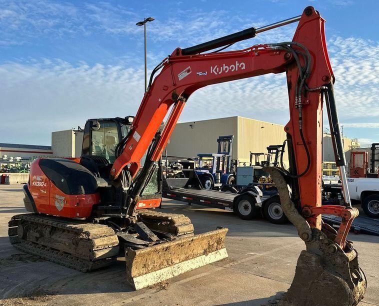 The 2021 Kubota KX080-4S2 mini excavator has 678 hours on the meter, though this may vary as the unit is still in use. It features a 3.3L Kubota V3307-CR-T-EW05 4-cylinder diesel engine and hydrostatic transmission with two-speed travel.
