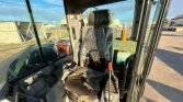 The machine includes an enclosed cab with AC, heat, and a pattern changer. It is equipped with auxiliary hydraulics (standard two-way) and a backfill blade that is 87 inches wide. The boom is standard with swing capability, and the stick measures 7 feet in length. A mechanical quick coupler is installed, and it includes a 30-inch bucket with five teeth.